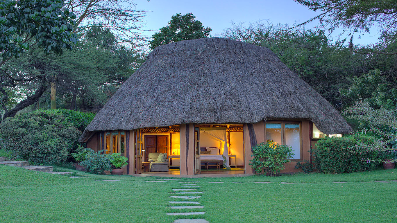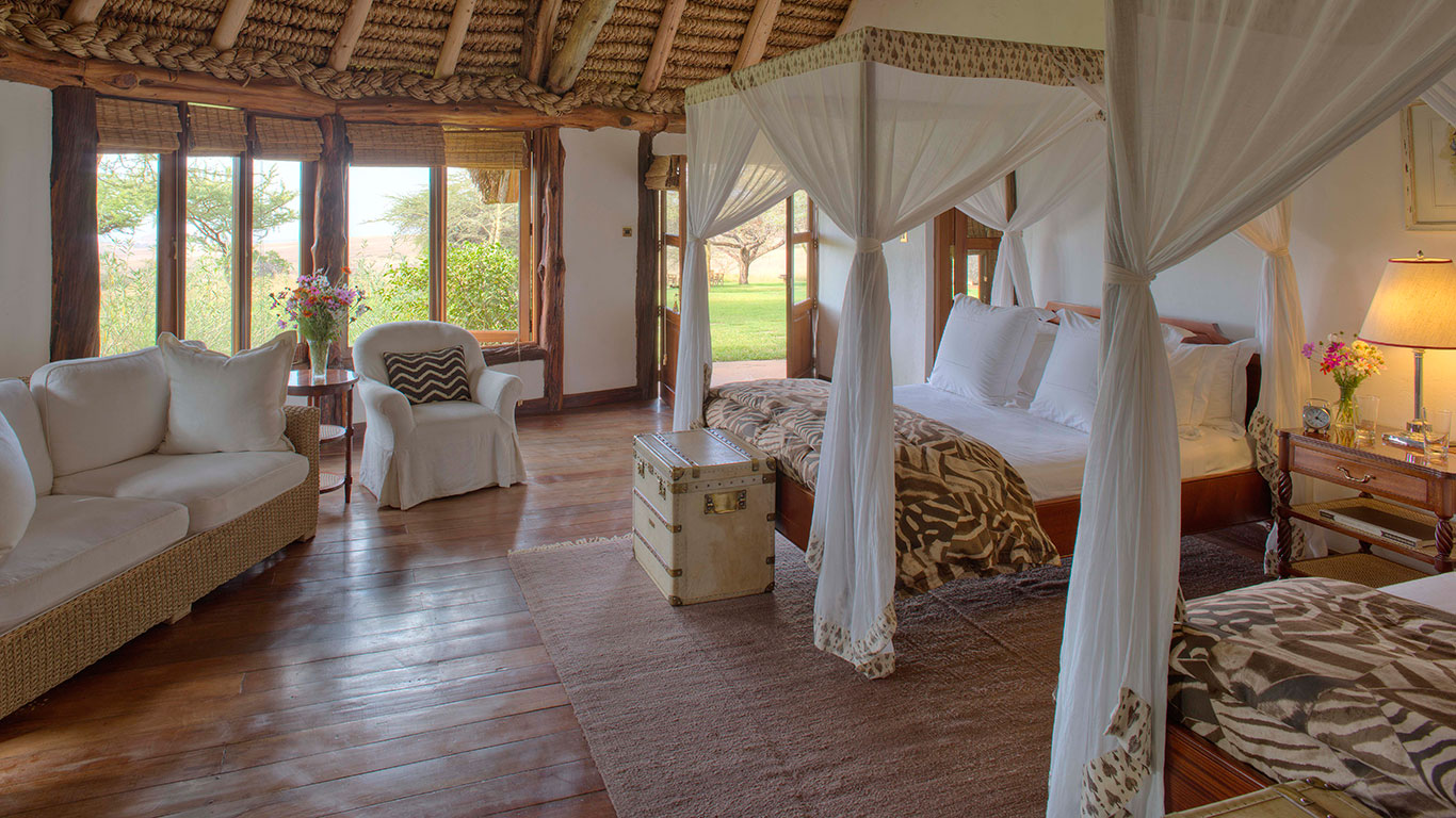 Five charming thatched cottages, all with well-appointed bedrooms, sumptuous four-poster beds and generous en-suite bathrooms, the property luxuriates in total exclusivity. The cottages are surrounded by an oasis of vibrant lawns filled with birdsong and spectacular views of the plains below.